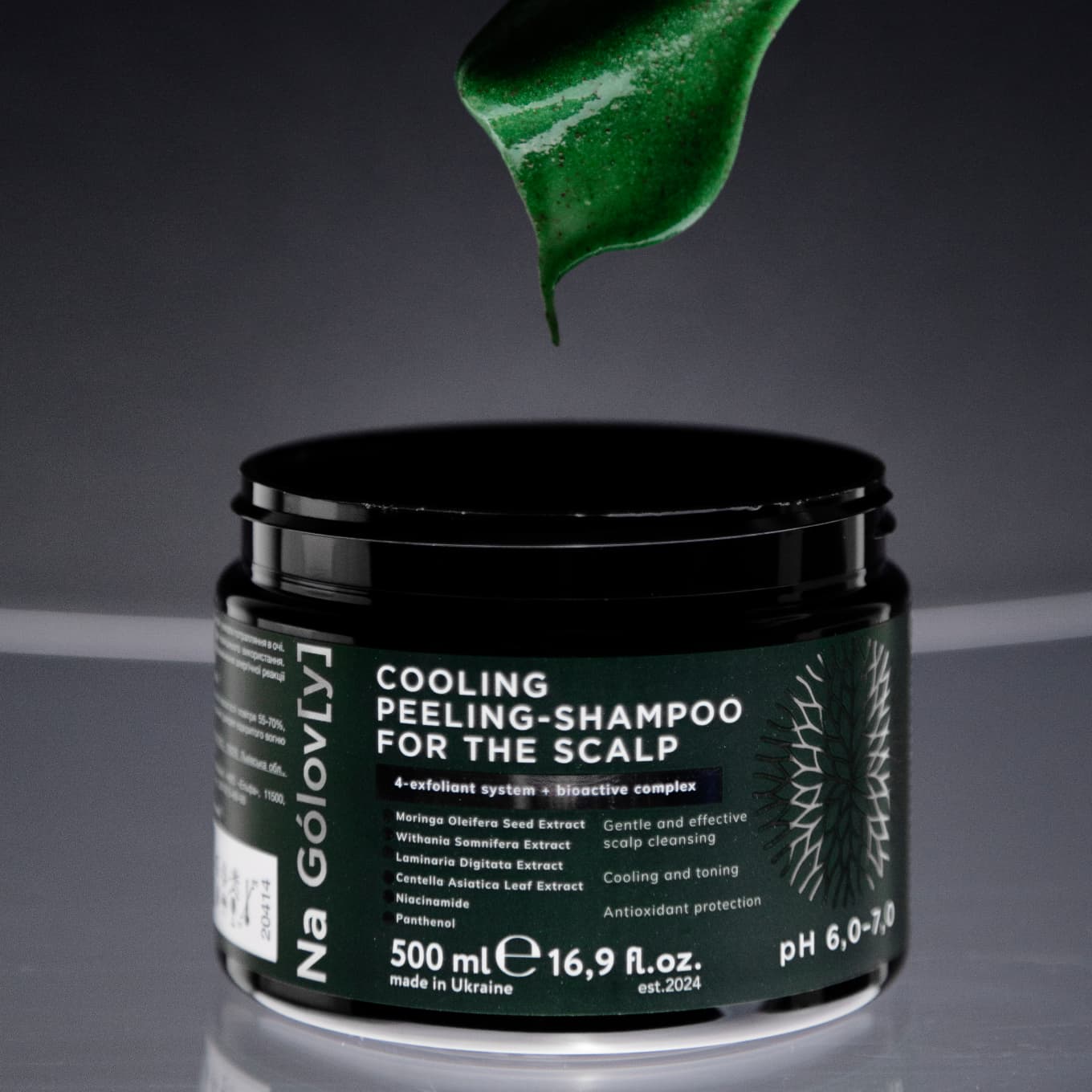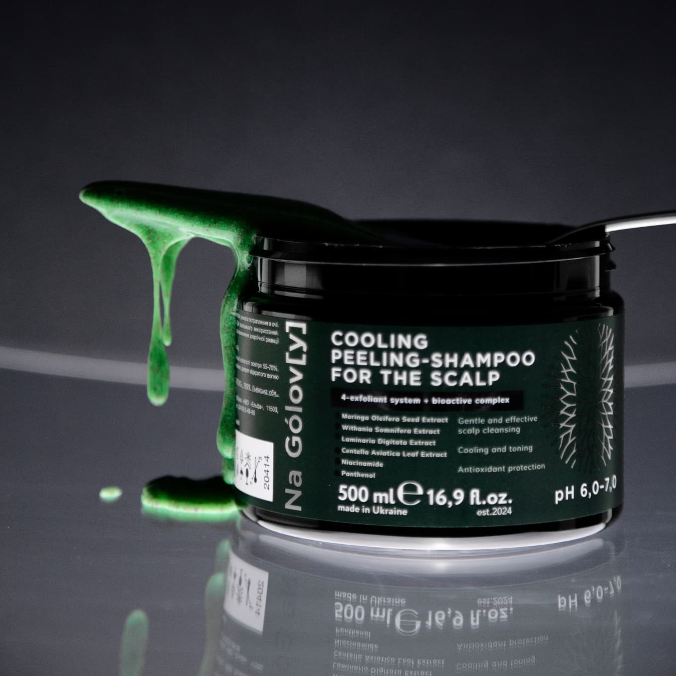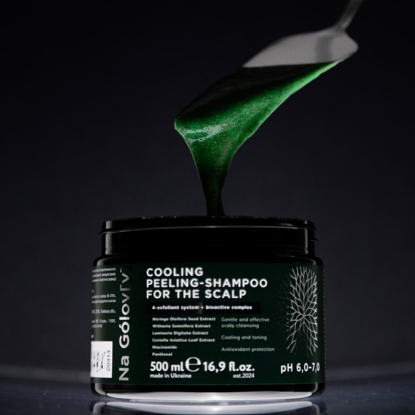 Охолоджувальний пілінг-шампунь для шкіри голови ТМ «Na Gólov[y]» забезпечує делікатне, але глибоке очищення шкіри голови, підтримуючи її здоровий вигляд. Система 4 натуральних ексфоліантів дбайливо відлущує ороговілі клітини, стимулює мікроциркуляцію та покращує проникнення активних компонентів. Біоактивний комплекс із екстрактами морінги, ламінарії, центели азіатської, ашваганди та спіруліни в поєднанні з ніацинамідом та пантенолом надає антиоксидантний захист і чинить заспокійливу дію.