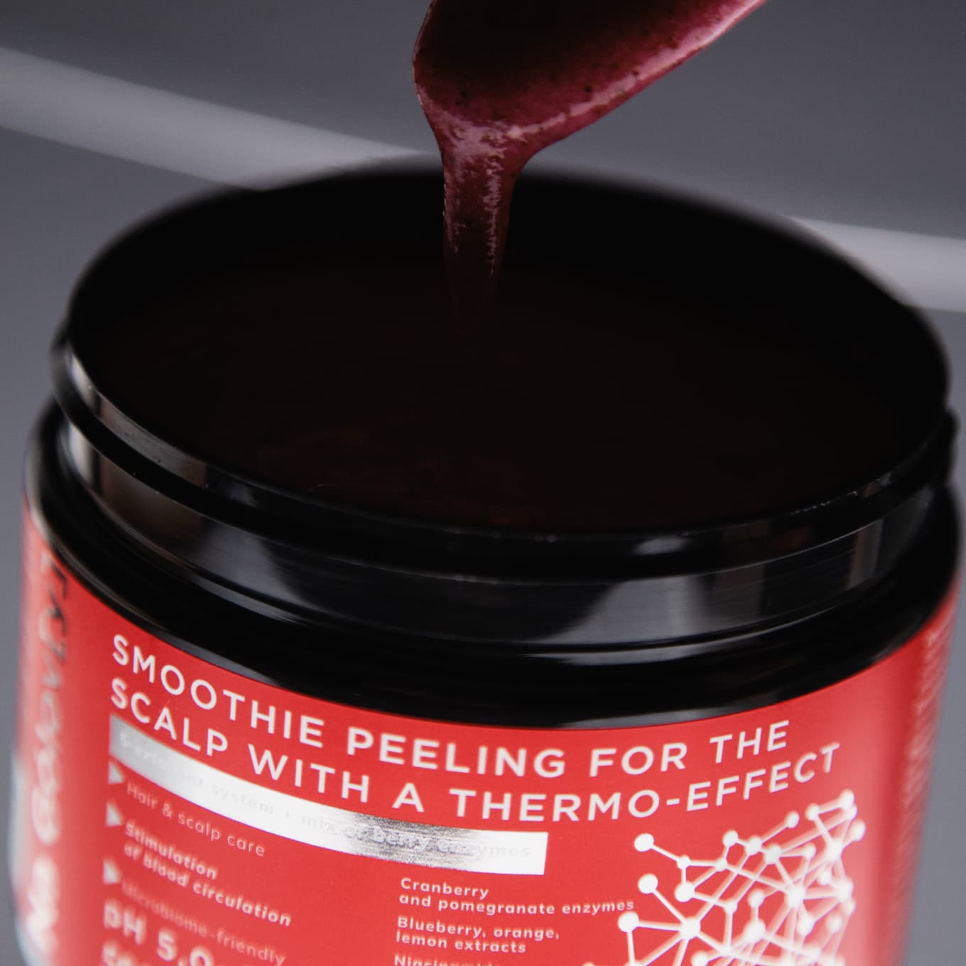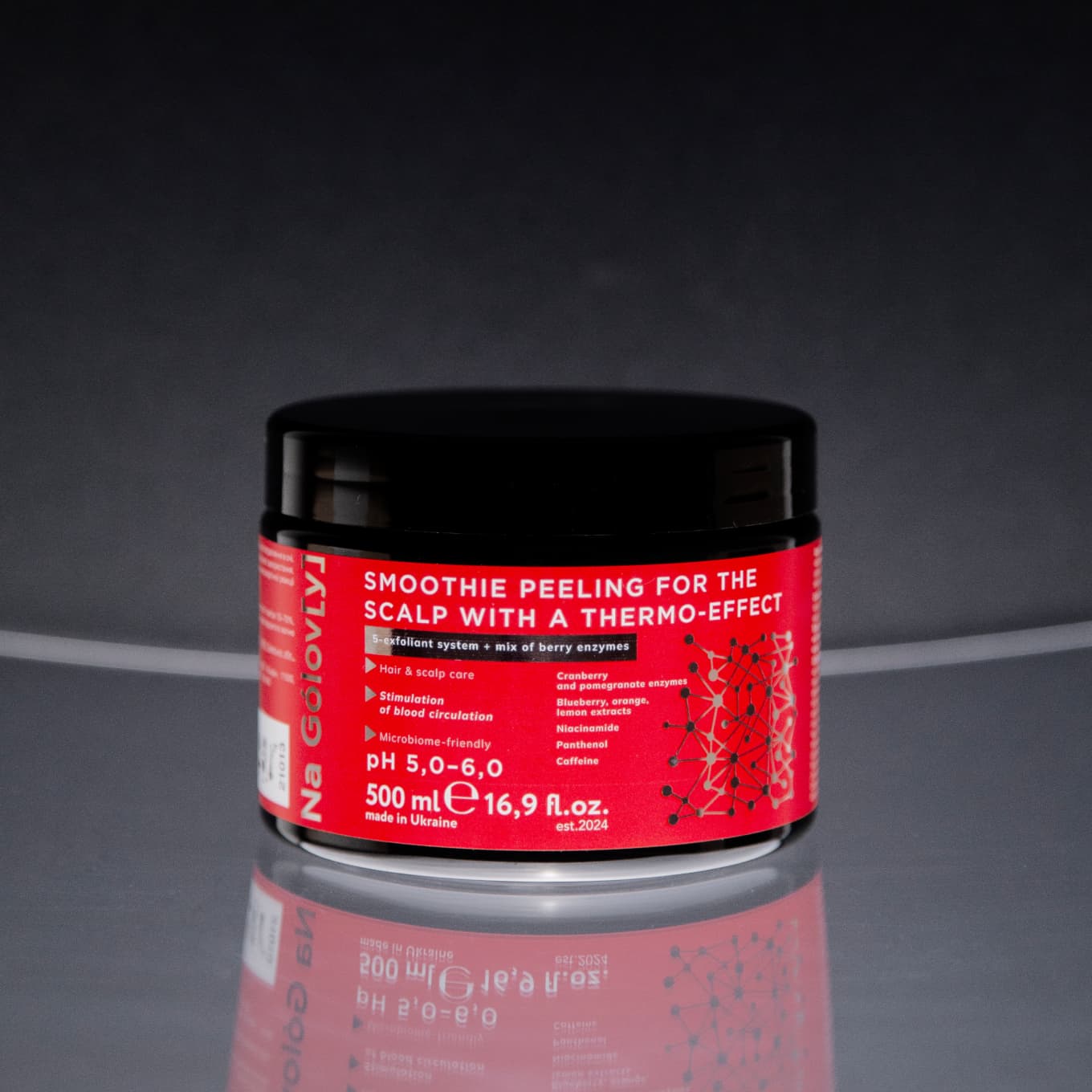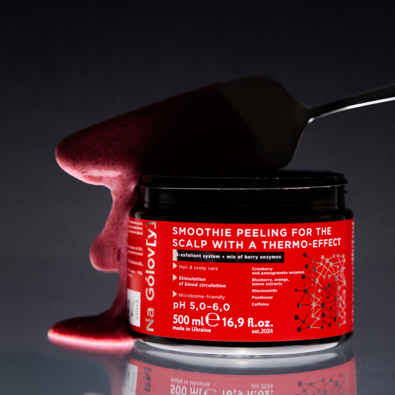 Смузі-пілінг для шкіри голови з термоефектом ТМ «Na Gólov[y]» завдяки дбайливо підібраному поєднанню ексфоліантів, ензимів ягід та фруктових екстрактів делікатно та надійно усуває забруднення різної природи зі шкіри голови. Покращує кровообіг, стимулює мікроциркуляцію в клітинах. Сприяє відновленню та підтриманню здорової мікрофлори шкіри.