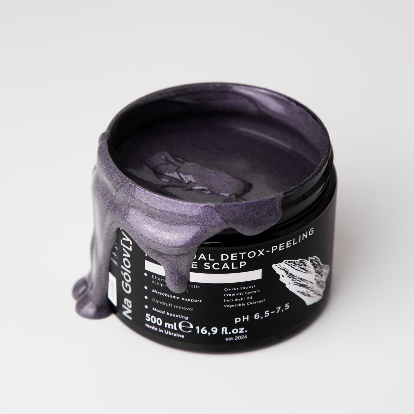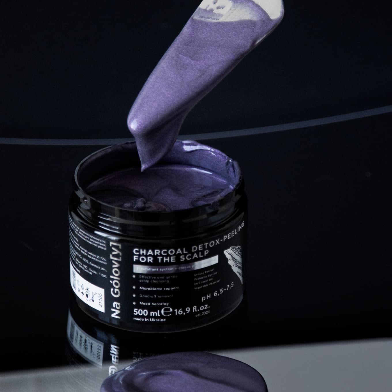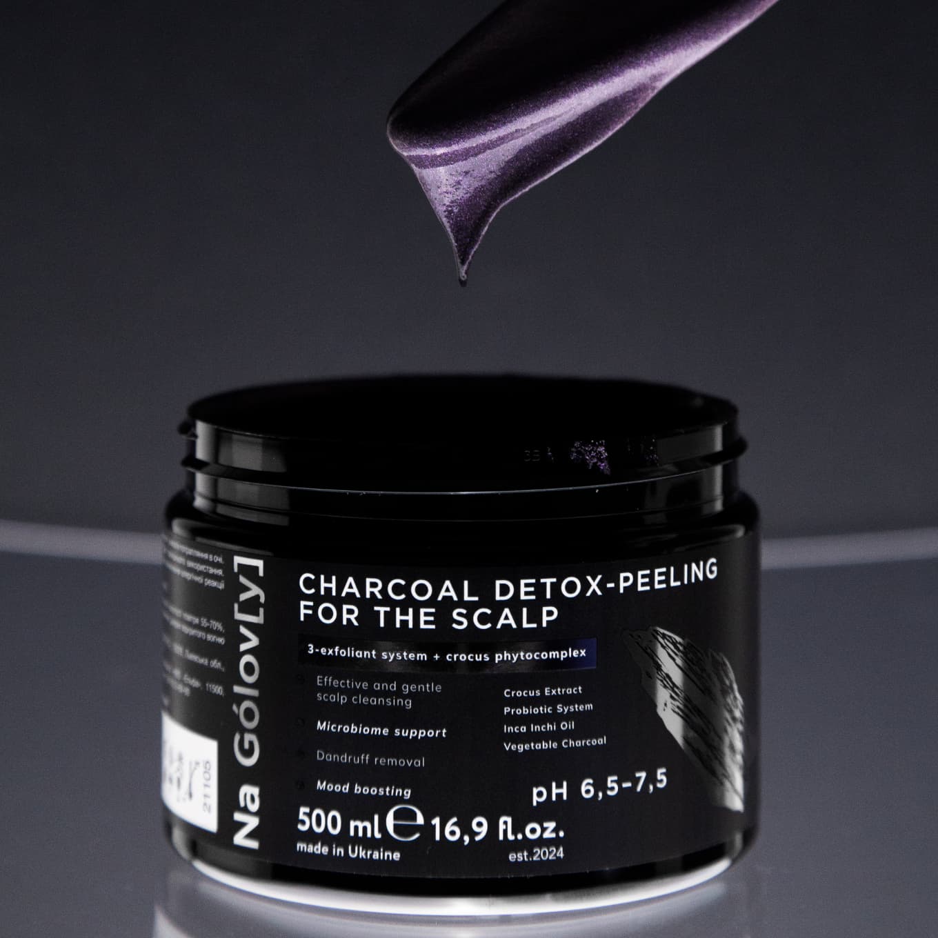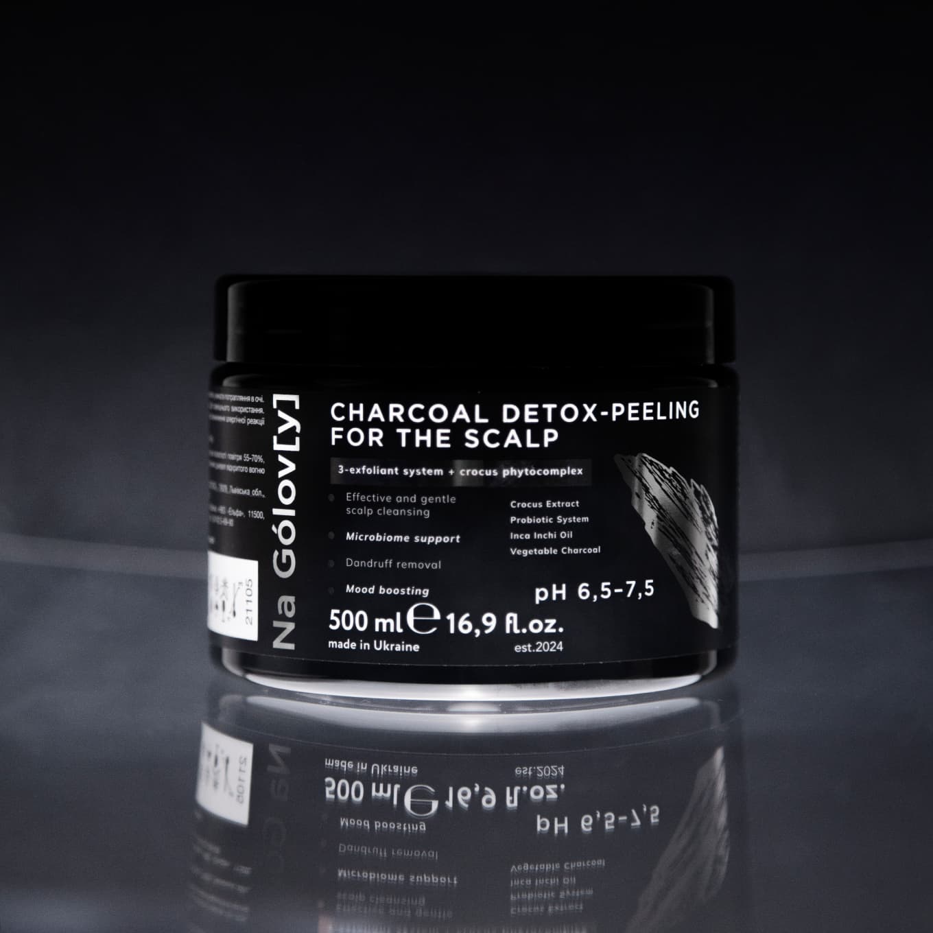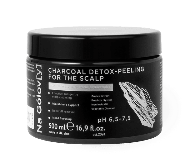 Вугільний детокс-пілінг для шкіри голови ТМ «Na Gólov[y]» завдяки ексфоліантам різної природи м’яко та ефективно видаляє зі шкіри голови ороговілі клітини епідермісу, накопичення себуму, пилу, бруду. Покращує кровообіг, стимулює мікроциркуляцію в клітинах. Підтримує екосистему шкіри голови, сприяючи балансу мікробіому. Надійно позбавляє від лупи. Дарує відчуття свіжості та комфорту.