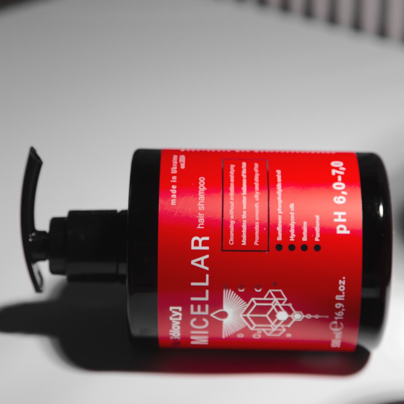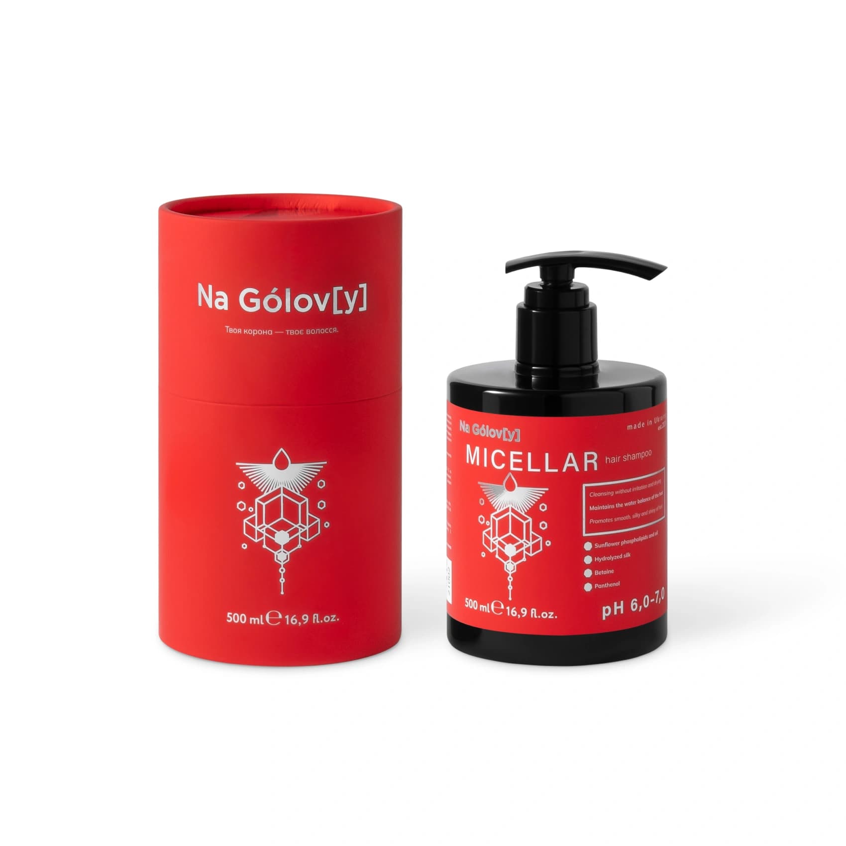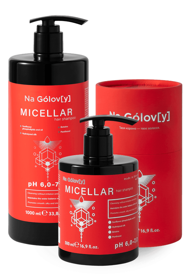Міцелярний шампунь для волосся ТМ «Na Gólov[y]» ефективно очищує шкіру голови та волосся. Поєднання фосфоліпідів і олії соняшника покращує стабільність міцел, утворених м’якими поверхнево-активними речовинами, і сприяє м’якому та ефективному видаленню забруднень, надлишку себуму та залишків стайлінгових засобів. Фосфоліпіди як природні компоненти клітинних мембран допомагають підтримувати захисний бар’єр шкіри голови, а олія соняшника пом’якшує та живить волосся, зберігаючи його природну красу.