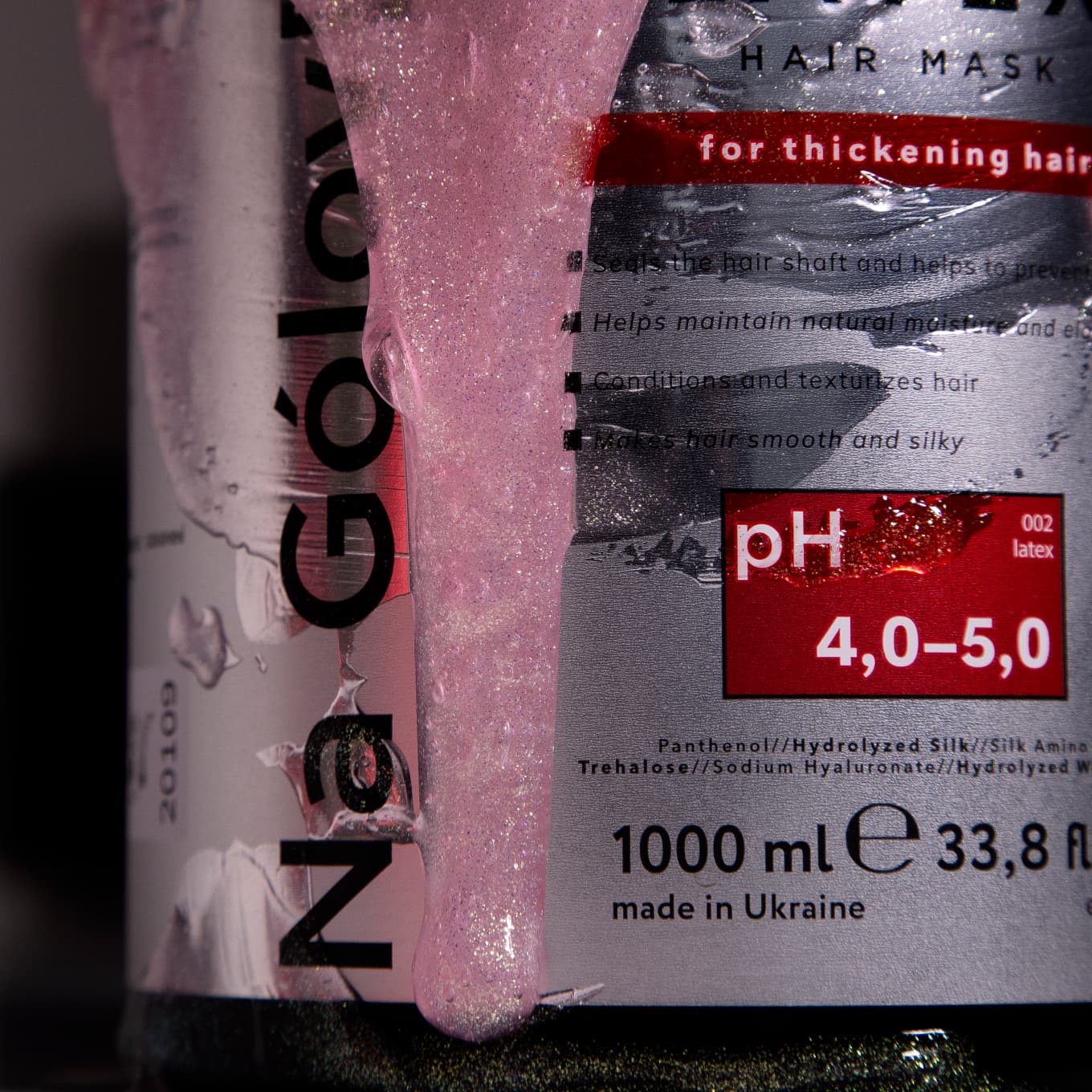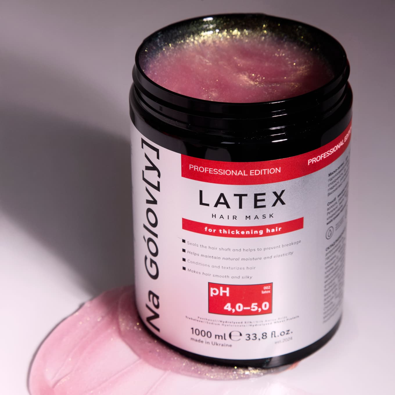 Маска-латекc для волосся ТМ «Na Gólov[y]» містить комбінацію гідролізованого шовку і кватернізованих амінокислот шовку, які мають високу спорідненість до поверхні волосся. Вони сприяють кондиціонуванню та гладкості, розгладженню лусочок кутикули й покращенню текстури волосся. Високий вміст пантенолу забезпечує зволоження та ущільнення волосся.